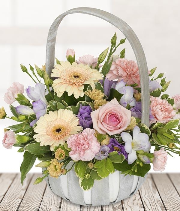 This year we have created something special. A ready to display Mother's Day gift with soft pink roses and peach coloured germinis, all lovingly pieced together into a basket arrangement.