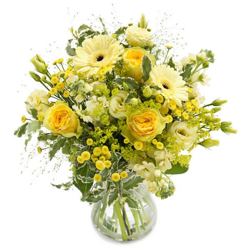 This beautiful bouquet conjures up balmy summer days. Yellow roses mingled with  gerberas, stocks and lisianthus and mixed foilages.